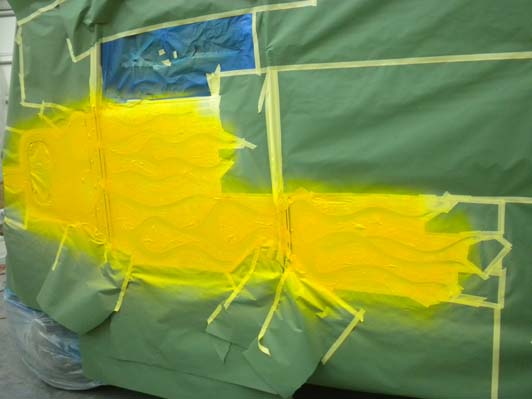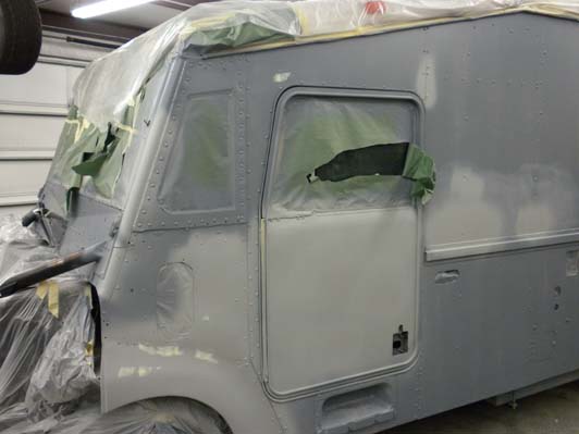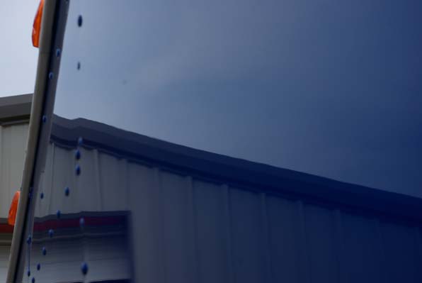 In time for the NSRA Springfield event the Monster was back on the road (temporary turn downs instead of the side exhaust). The first dive for Norm was with a full load. The hills between Lead Hill and Springfield were no problem for the new engine. Mileage improved too. Not a bad conclusion for an engine swap. During the event in Springfield Norm was so happy with the way the hauler now hauled that he had another idea. "Hey, you guys did a great job with the engine, do you think you could paint it?" Razorback Rides has a new booth but the Kookie Monster is more than just a little too big to fit. Two 100 rolls of masking film covered most of the things in their fab building while the Monster received a new paint job. Norm did not want to go overboard so he requested a basic flat black paint scheme. Razorback Rides said the difference in work between a flat black job and pearl blue with red and yellow flames was not great enough to justify the monochrome approach. Norm said keep it simple till the day he saw it painted. Norm was quick to say, " I knew blue with flames would look fantastic". Razorback Rides offered to spray a quick coat of flat black over the vehicle if that was really what Norm wanted. To be polite Norm said "No, thats OK."