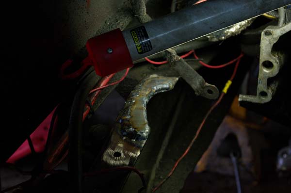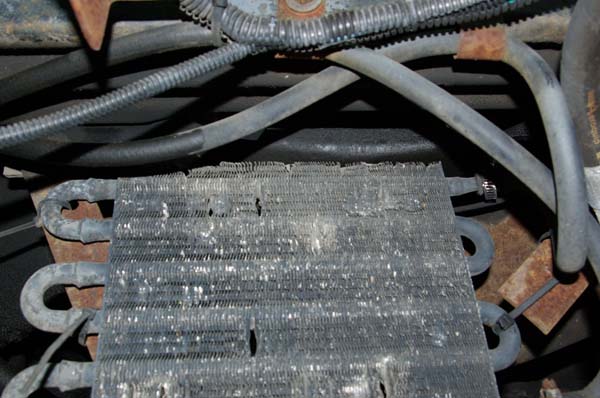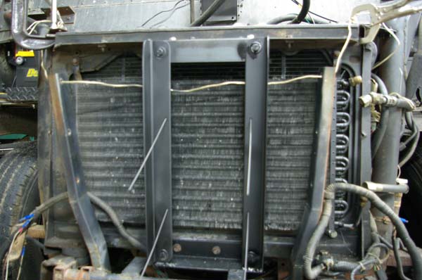The old transmission cooler dangled by a few cable ties. A much larger cooler is now supported by a custom bracket assembly.
