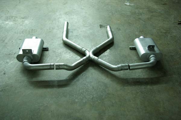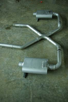 Since the new headers looked so good Norm said that it would be a shame to splice them into the rusty old exhaust system. Another recommendation from the folks doing the work was to switch from the existing " H" pipe system to an "X" pipe style. Typically "X pipes do what "H" pipe system do but often they do it a little better. More low-end and better sound reduction. Low-end torque is very important in a heavy vehicle like the Monster. Based on the horsepower and rpm range of the 502 a 2.5" diameters system was fabricated. It was welded from mandrel bends and a universal "X" pipe kit. How many trucks have exhaust systems that look this good? Whats with the extra bends? Norms creative side made a request, "Six inch side pipes running from wheel well to wheel well please." Typically side exhaust consists of a short pipe from the exhaust manifolds to the pipes and a glass pack is used in the side pipe. Razorback Rides has some chassis dyno experience with that type of system and feels that it is not the most efficient exhaust style. The design of the Monsters chassis allowed for a modern/efficient system with low restriction Flow Master mufflers before the functioning side pipes. It required a lot more effort than a typical side exhaust system but everyone agreed that Norm is worth the trouble (especially Norm).