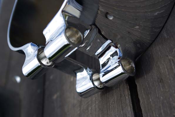 Several options were explored for hanging the pipes. Ultimately exposed hangers were chosen. Razorback Rides suggested that some type of decorative skull or a Norm head would look good at the top of the hangers. Norm agreed and told them," Sounds like a lot of work, make sure they all look the same." A nice shop, but they just dont know when to keep their mouths shut. After a many hours of cutting, welding and grinding, heads and hangers were ready. When Norm saw the results he knew exactly what to do. A quick phone call to Steve Tracy at Advanced Plating had the path ready for some really slick chrome. Everybody was very pleased with the end result. As Razorback Rides had planned, the pipes mounted in a very simple way once all the details had been fabricated.
